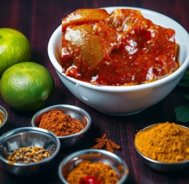 Lemon pickle, or nimbu ka achaar, is a tangy, salty, and often spicy condiment popular in Indian cuisine. It is made from lemons marinated with salt and spices, with some regional variations including oil or jaggery. A small amount of lemon pickle is often served alongside traditional Indian meals to aid digestion and add a burst of flavor.