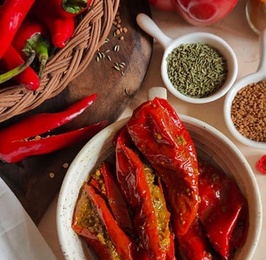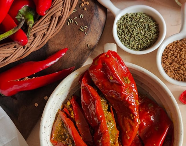 Stuffed red chili pickle, also known as bharwa lal mirch ka achar, is a popular North Indian condiment made by filling large, thick red chilies with a tangy and aromatic spice blend. The pickle is then sun-cured for several days, which softens the chilies and allows the flavors to meld together.
